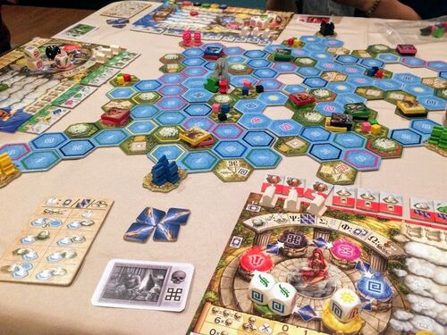 これはなに? ライナー・クニツィア先生が作ったデッキ構築型のすごろく! マス目は六角形で森や砂漠、水場など地形の種類がある